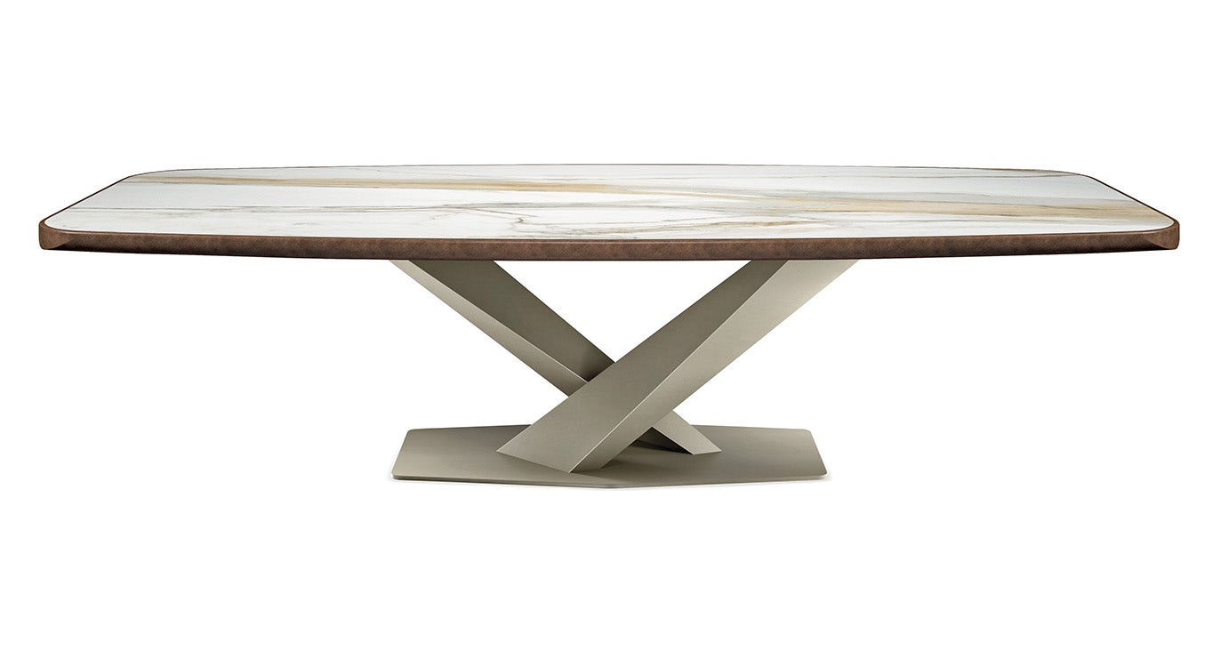 Table with base in titanium (GFM11), bronze (GFM18), graphite (GFM69) or black (GFM73) embossed lacquered steel. Top in ceramic Marmi Alabastro (KM02), matt Golden Calacatta (KM05), glossy Golden Calacatta (KM06), matt Portoro (KM07), glossy Portoro (KM08), glossy Sahara Noir (KM09), Makalu (KM11), Breccia (KM12), Borghini Calacatta opaco (KM18), Borghini Calacatta lucido (KM19), Colosseo (KM21), Andromeda (KM22), matt Invisible (KM24) or Luxor (KS23) with Brushed Bronze or Brushed Grey lacquered and rounded lower profile. 6cm thick top on 300x128 version and 5cm on 200x120 and 240x120 versions.