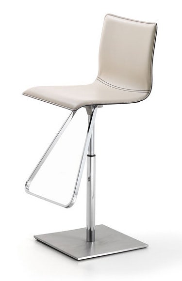 Swivel and adjustable in height stool with satin stainless steel base plate and column, footrest and gas piston in chromed steel (08) or with base plate, column, and footrest in black (GFM73) embossed lacquered steel and gas piston in chromed steel (08). Seat covered in leather as per sample card. Available with round base on demand.