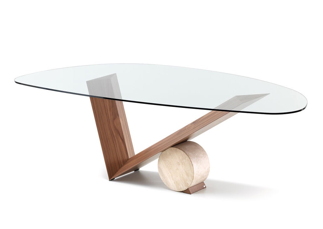 Table in Canaletto walnut (NC) or burned oak (RB) and cylinder in Travertine (TN), black Marquina (NM) or white Carrara (BC) marble. Top in 15 mm clear glass, laid on the base. The shaped top 240x115 is 12 mm thick.