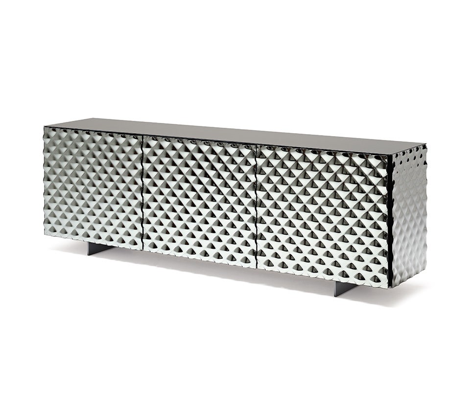 Sideboard with doors and sides in quilted fumé or bronze mirrored glass. Top in fumé or bronze mirrored glass. Profiles in embossed lacquered black (GFM73) aluminum. Feet in polished stainless steel or matt graphite lacquered (OP69). Sideboard 2 or 3 doors in graphite lacquered wood and internal clear glass shelves. Optional: internal drawer in each door.