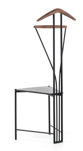 Valet stand with frame in matt black (OP17) steel and solid Canaletto walnut (NC). Seat in black painted ashwood or covered in soft leather as per sample card.