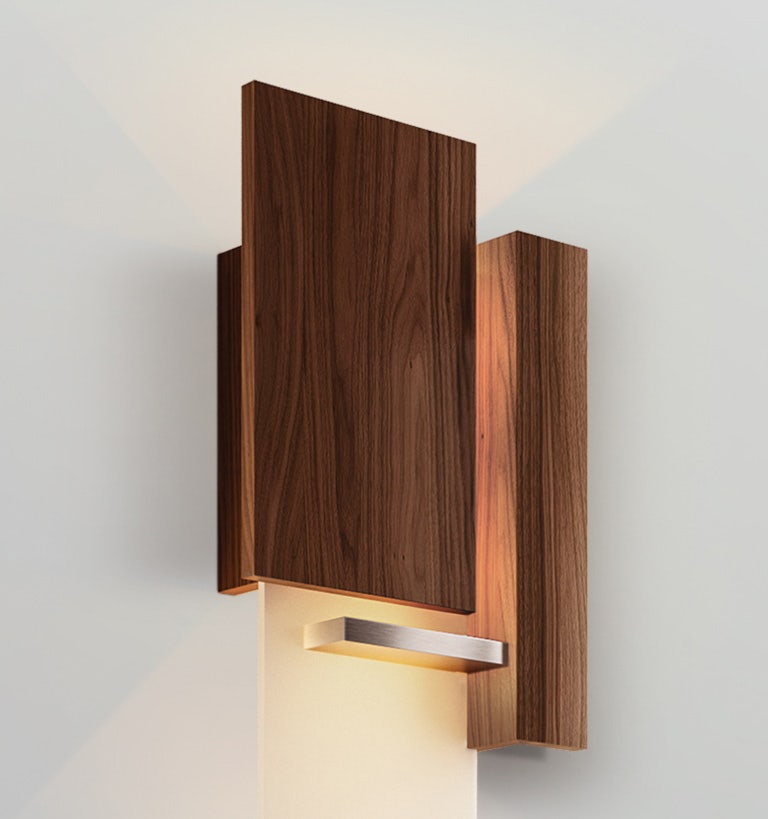 The Vesper is a very simple geometric sculpture composed of brushed aluminum, oiled black American walnut, and white polymer. The light not only washes up and down the wall but also filters out through the composition, exhibiting the fixture´s depth in three dimensions.