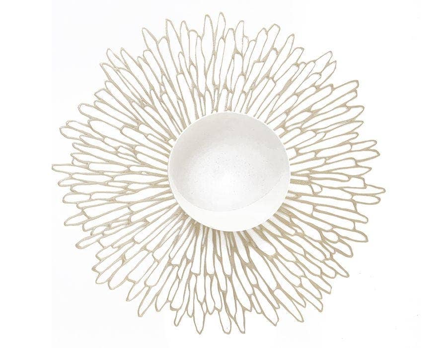 Combining the organic exuberance of a chrysanthemum with the graphic refinement of a contour line sketch and a modern palette of metallic hues, Bloom is a fresh interpretation of florals. This flexible openwork placemat can also function as a charger, acting as a decorative base for whatever is placed on top.