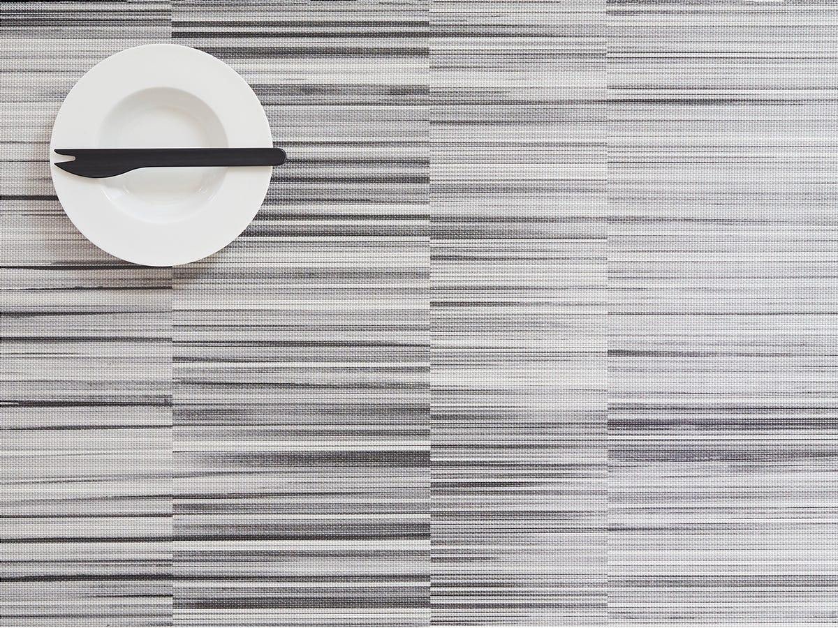 With its finely striped bands of varying widths and tones, this graphic design is a printed interpretation of the Japanese tradition of weaving scraps of old fabrics into sakiori textiles, from the word saku (to tear or rip) and oru (to weave). The Chilewich design team looked to antique sakiori textiles for inspiration and reimagined their intricate weave structures and lively lines in two dimensions with ink and paint.