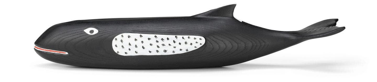 A prominent feature of the Eames collection was a huge wooden whale over two metres in length, an anonymous work of North American folk art. Charles and Ray Eames were exceptionally fond of the painted object: it occupied a permanent place in the Eames Office and was also used in photo shoots – such as the first photos of the Lounge Chair. The smaller-scale reproduction of the Eames House Whale by Vitra is crafted from ash wood and painted by hand.