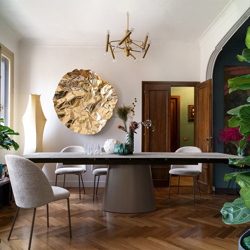 Its monolithic and essential design is elegant in any setting and perfect for any decor. Ellisse is an extendable table with ceramic tops and a monolithic base in curved painted sheet metal.