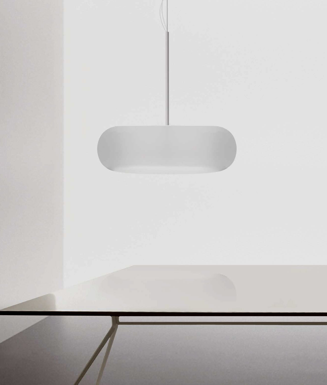 Magnificently simple and powerful, Naota Fukasawa’s Itka subtly but uniformly spreads light. Made of opaline frosted glass and PVC-covered, white lacquered metal.