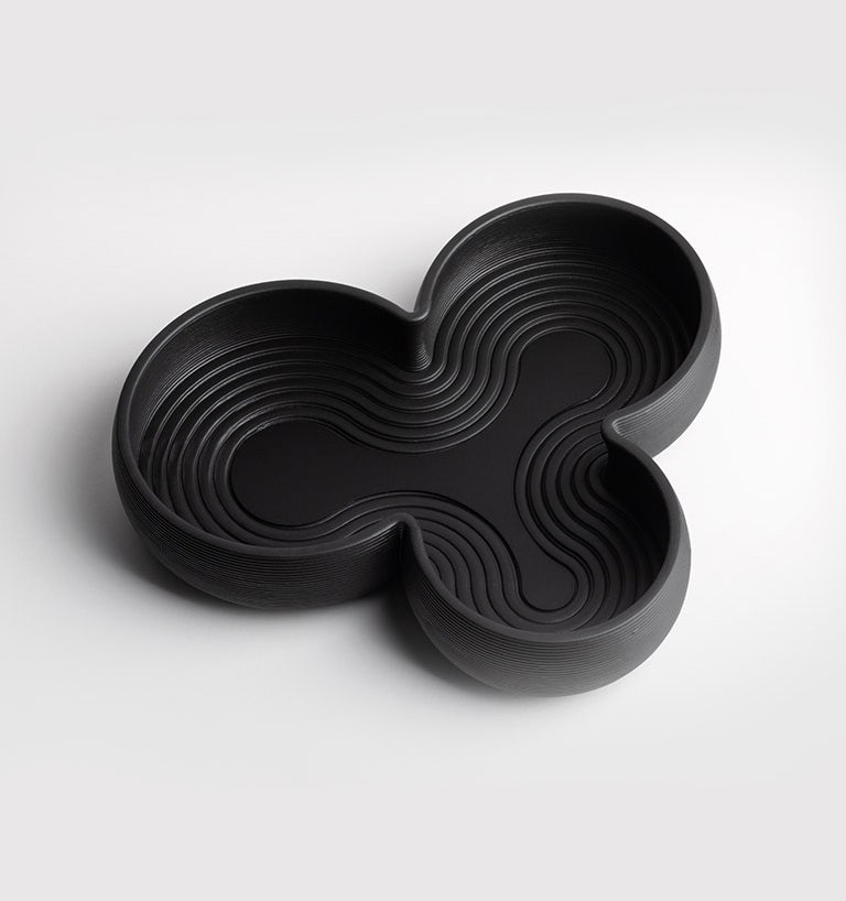 Clay 3D printing is an innovative and experimental technology due to the difficulties involved in creating volumes with dense fluid materials: the shapes are in fact created layer upon layer through the LDM (Liquid Deposition Modeling) process. Once solidified and cooked, the clay is then subjected to finishing with an opaque black crystalline that gives it the final color and protects the material making it suitable for contact with food.