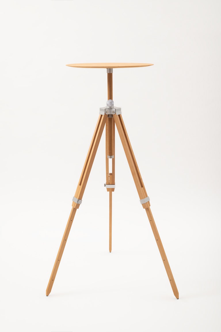The wooden structure inspired by an artist’s tripod supports a top. The body of the coat stand with six hooks and an umbrella stand. Five different heights to offer practicality and freedom of use: a laptop rest, a pedestal or a serving table.