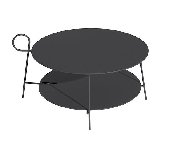 Collection of small coffee tables where the leg, gracefully rising towards the edges of the top, turns into a curl. technically it is nothing but an object, with an almost brutalist aesthetic in painted sheet metal, but the color and this sweet gesture of poetry transform it into a presence that invites calm and dreams.