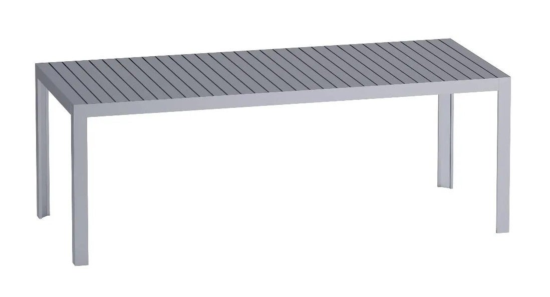 Table made completely of extruded aluminum in two finishes: white polyester powder or silver aluminum anodized. The top is made of slats placed side by side, legs are made of extruded aluminum with adjustment foot for levelling. Indoor/outdoor use.