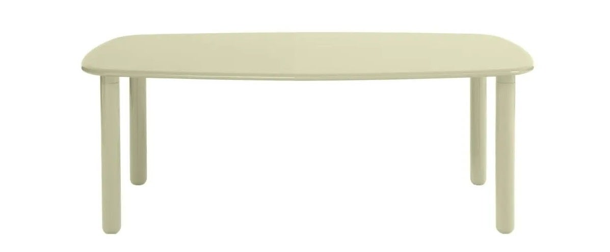 Table with top made of mdf with shaped edge to "soap" and rounded corners, legs in solid wood with the part on the ground rounded half-sphere, steel structure, glossy lacquered finish in three colors. Indoor use only.