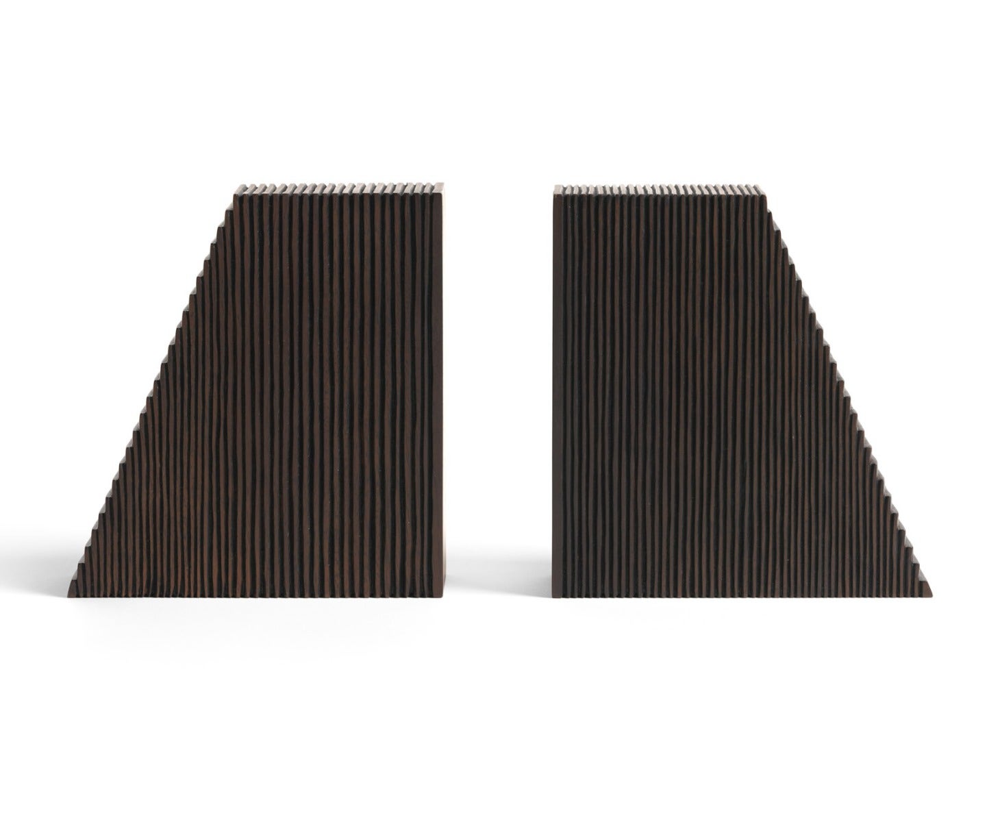 The Grooves book ends are soulful to say the least. Every single line you see is hand carved, making each piece truly unique. Small imperfections are part of the story, even more so: they enhance Grooves' character. The result is a slightly different surface every time, each with its own rhythm and dynamics. Made from solid mahogany finished with a dark brown varnish, these book ends complement the wider Grooves collection.