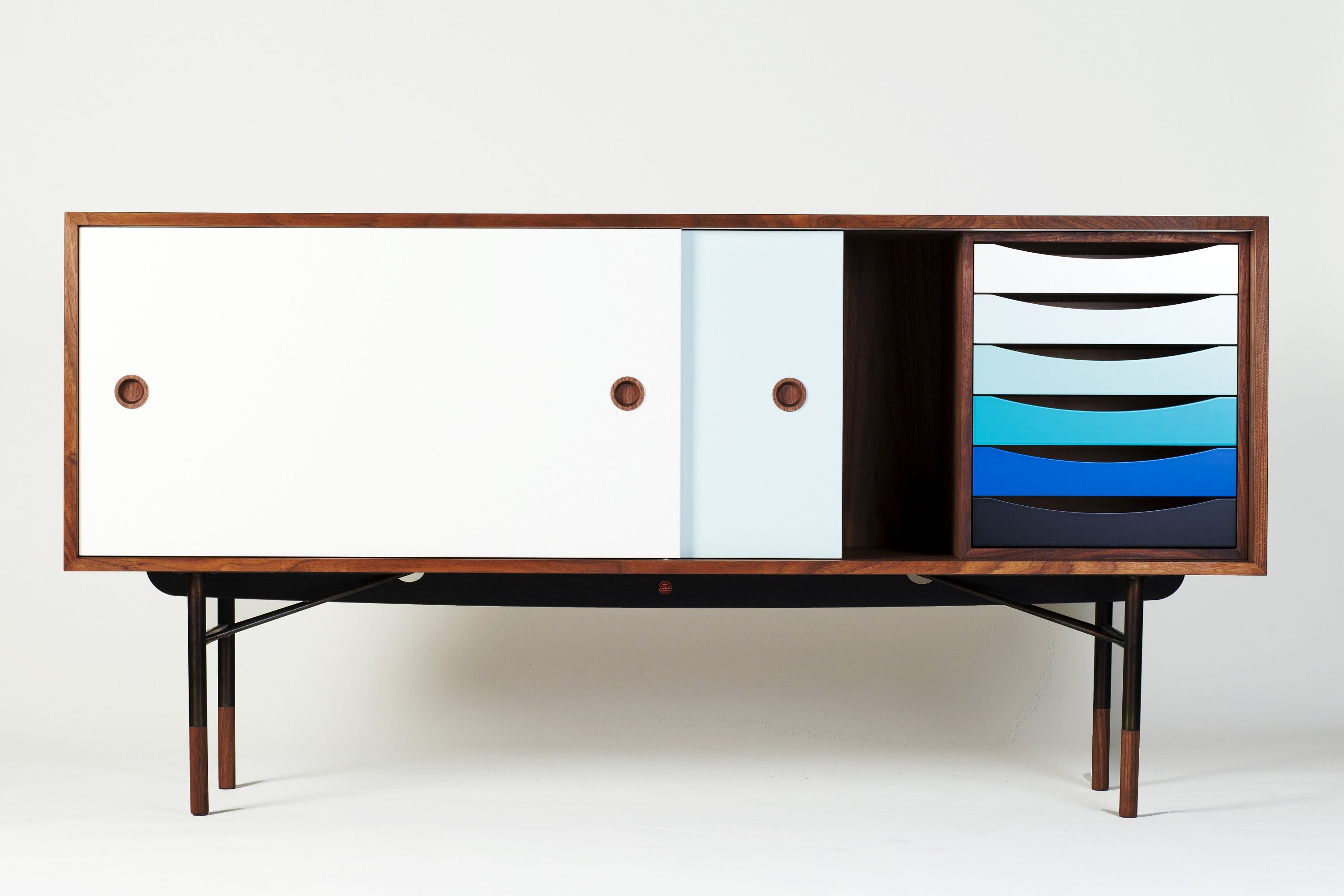 After Finn Juhl’s rise to stardom in the American design circles around 1950, he became increasingly inspired by his American colleagues - Charles Eames in particular. Up until then, wood had predominantly been his preferred material but at this time he gradually started experimenting with steel as well. This newfound simplicity with its straight lines became evident in his designs of desks, dining tables, coffee tables, benches, sideboards and sofas for the Danish furniture manufacturer Bovirke. These designs, with their burnished steel frames and wooden toes, were Finn Juhl’s response to the criticism he had received in terms of his artsy sculptural designs and exclusivity.