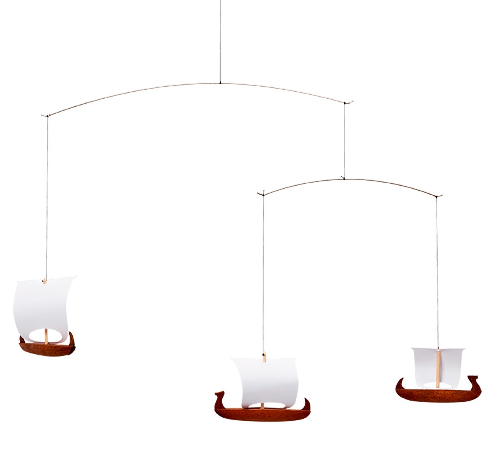 Three graceful Viking ships, with full sails set for the foreign shores. From about the year 800 until 1050, the Vikings sailed far and wide in ships like these. The ships in the mobile are carved from teak.