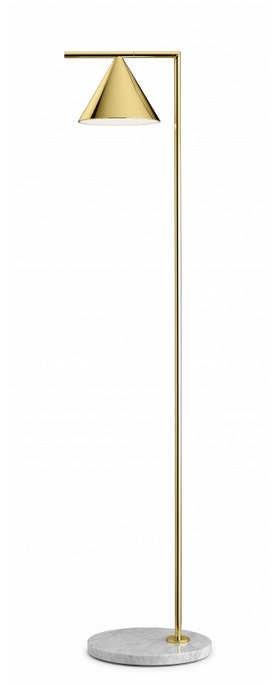 Floor lamp providing adjustable direct light. Painted steel or brushed brass, stem and metal spinning cone. Opal photoengraved PC diffuser by injection molding. White Carrara or Black Marquina marble base. Power cord length 260 cm, with foot dimmer switch that provide ON-OFF functions and 10-100% light adjustment. Plug-in power supply with interchangeable plugs