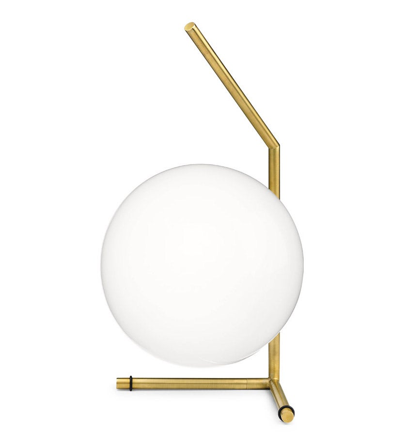 This contemporary light was designed by Michael Anastassiades in 2014 and consists of a mouth blown opaline sphere held up by a brassed steel frame. The opaline glass diffuses a tantalizing balance of light to any space. There is a dimmer on the power chord.