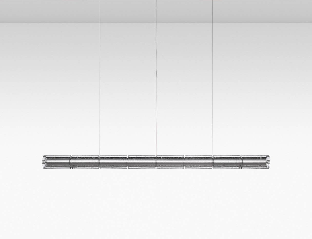 Although suitable for residential and commercial projects, it creates a remarkable artisanal quality, with craftsmanship evident in its intricate details. The glass cylinders are meticulously formed by pouring glass into a mold, with the glass maker's movements imprinting unique markings on each piece.