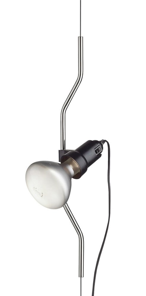 The word "Parentesi" (Italian for "brackets" or "parenthesis") refers to the nickel- plated shaped tube on a ceiling to floor steel cable that is connected to the floor and ceiling and can reach up to 157". The tube allows the lamp head to move vertically along the cable. The head fixture is an injection-molded black elastomer that comes with a switch.