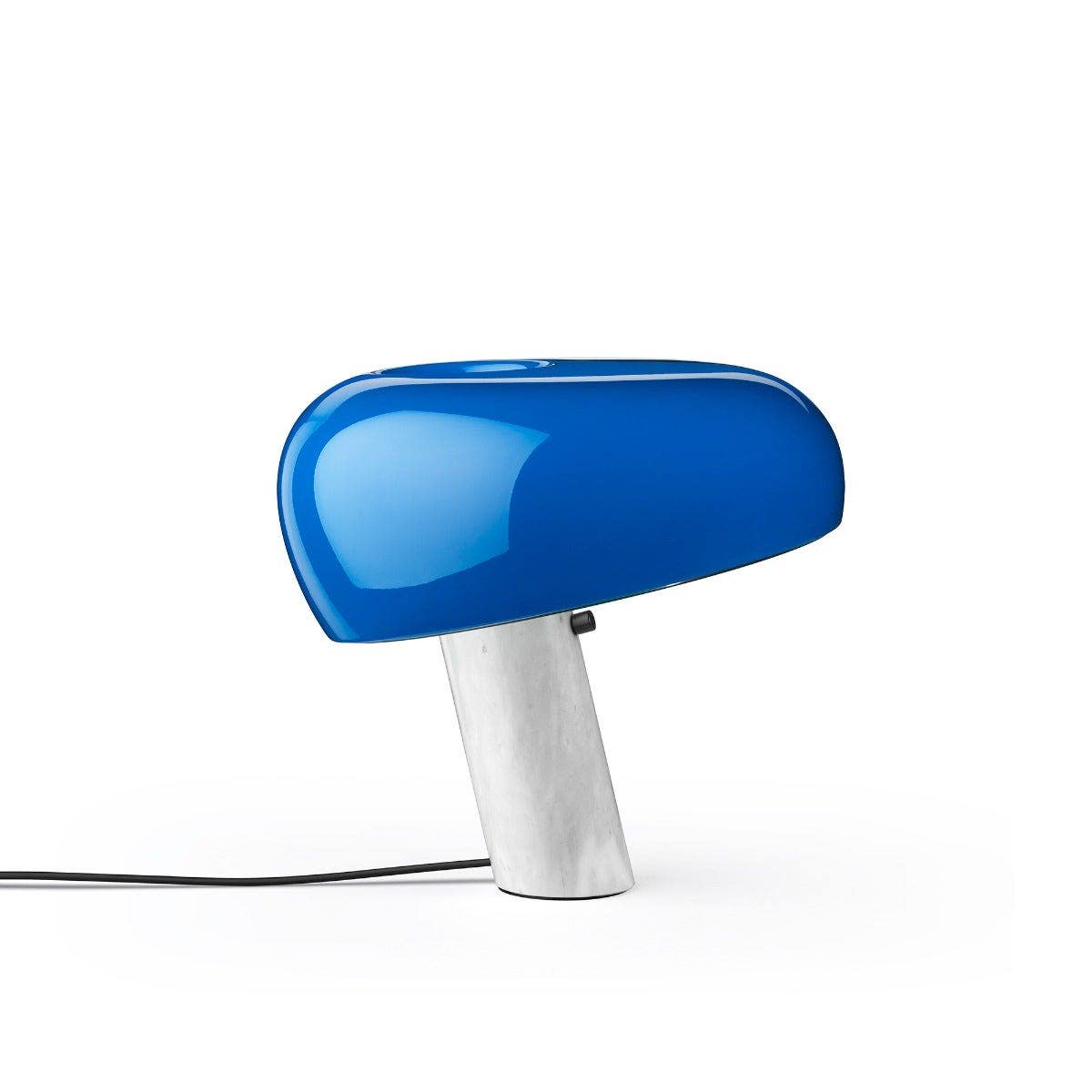 The Snoopy provides direct light through a thick glass disk and an enameled reflector, both resting in perfect balance on a white marble base. There is an internal dimmer and switch.