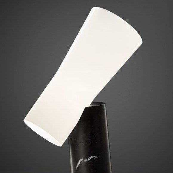 A sophisticated sculptural lamp that blends contrasting elements in a dynamic composition of volumes.