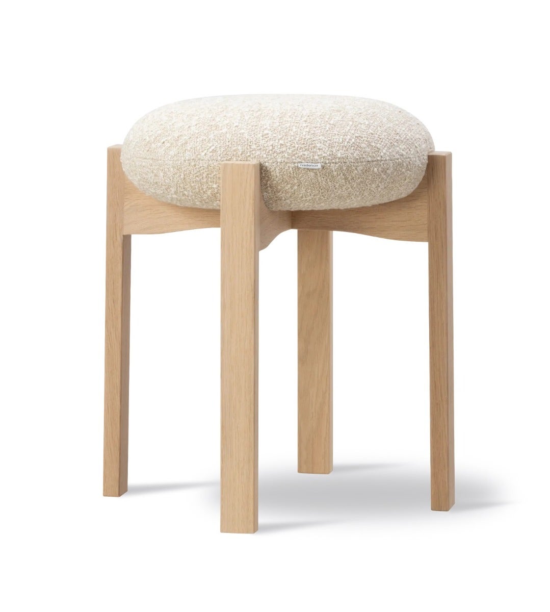 The sculptural Pioneer stools by Maria Bruun combine good seating comfort, functionality and a sculptural design language that elegantly combines the seat’s soft and round design with the wooden frame’s sensuality. The four vertical legs of the wooden frame are united in a cross composition with elegant indentations, where the light, the upholstered seat cushion, is placed on top.