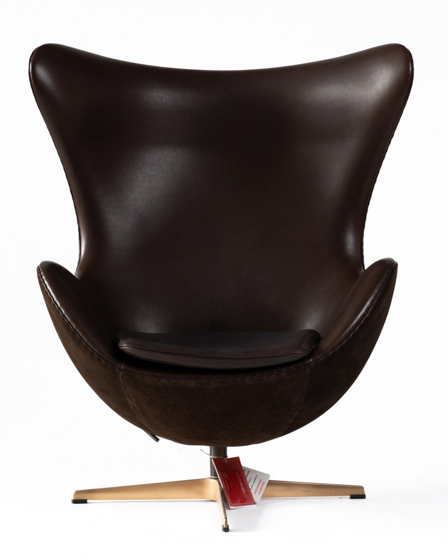 This particular chair is numbered 265/999. The limited edition collection for the first time included chocolate brown suede on the back and dark chocolate brown leather on the front. The sophisticated combination of leather and suede is perfectly complemented with a base in solid bronze; hand polished to create a unique finish. The bronze base will darken in appearance, becoming more beautiful over time. Each of the 999 Eggs were individually engraved, under the seat cushion, with a unique number and a brief text about the history and origin of the Egg chair design. “We wanted to create something special to celebrate the golden anniversary of this legendary design created by one of the world’s most visionary architects, Arne Jacobsen”, explains David Rosenkvist, Vice President of Branding & Communication at Fritz Hansen.