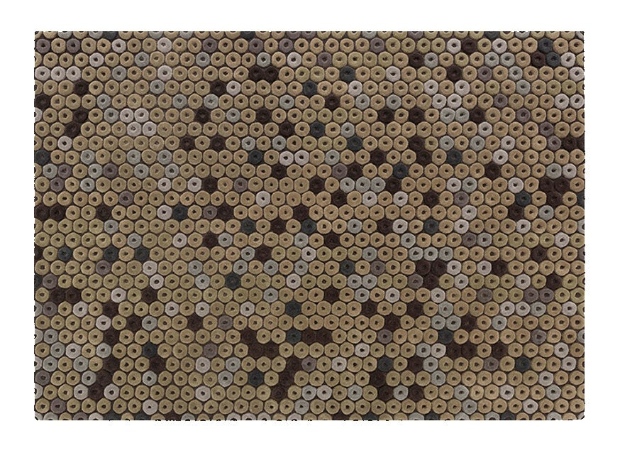 Candy with a hole: CHIMOS takes its name from sweets that were so very popular in the eighties, also known as Life Savers in America. In CHIMOS the protagonist is a single figure, the disc, repeated in a chromatic declination of its main color on a contrasting background. The graphic line that defines each disc acquires strength thanks to variations in volume generated through the laborious work of hand-tufting in virgin wool.