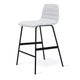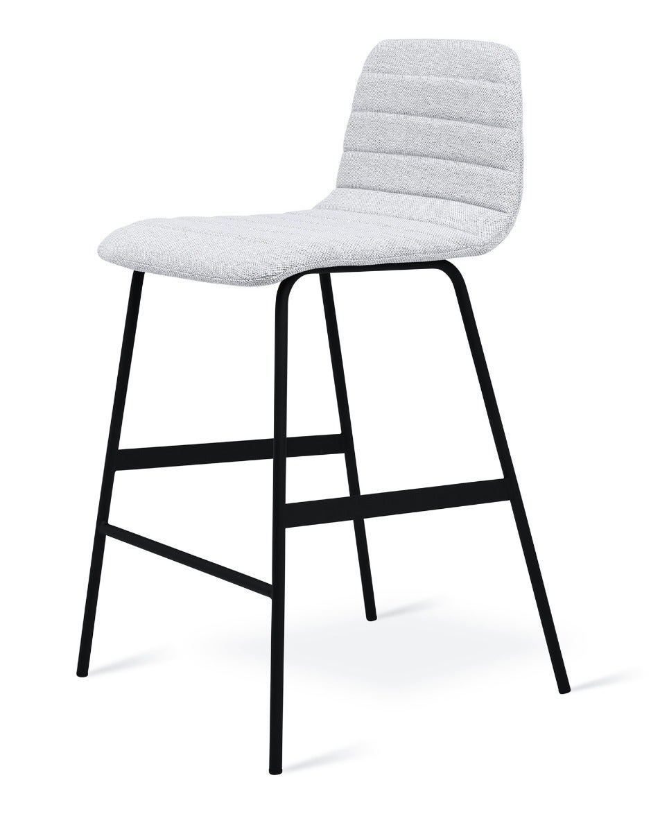 The Lecture Stool is a modern reinterpretation of a classic elementary school chair design, adapted for counter height use. It features a one-piece, bent-plywood seat and back, with a functional leather and brass handle. The black, powder-coated steel legs are reinforced with sturdy flat bar stabilizers and a simple ergonomic footrest. The Lecture Stool combines comfort, design, and durability. Available in black, walnut, or ash.