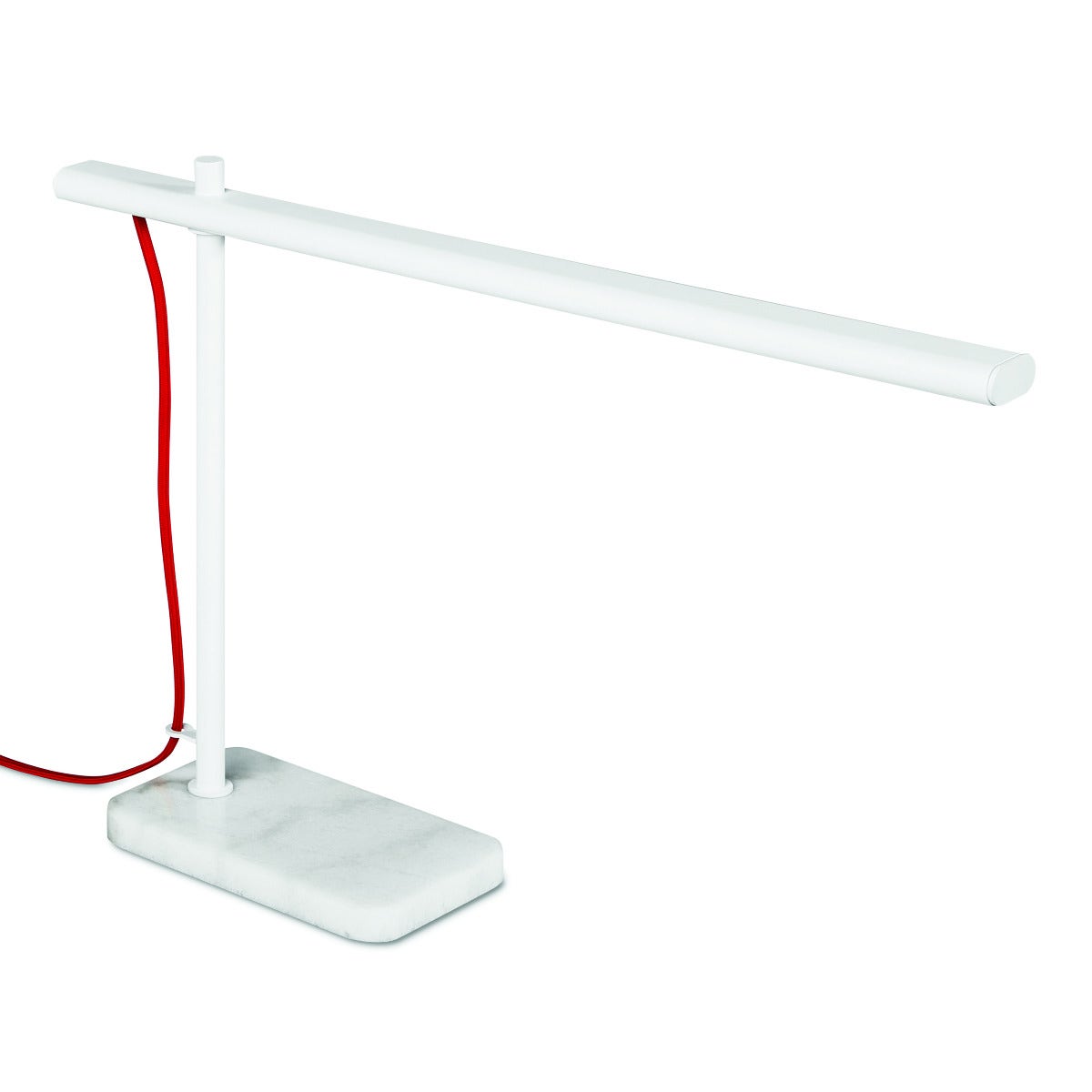 Echoing the Bauhaus movement, this slender table lamp couples minimalist modern design with easy functionality. Clean lines juxtapose statement-making details like a vintage-inspired, red-braided electrical cord and natural marble base. Whether it’s used as a desk light or bedside table companion, a dimmer switch lets you find just right level of brightness to focus efficiently on the task at hand.
