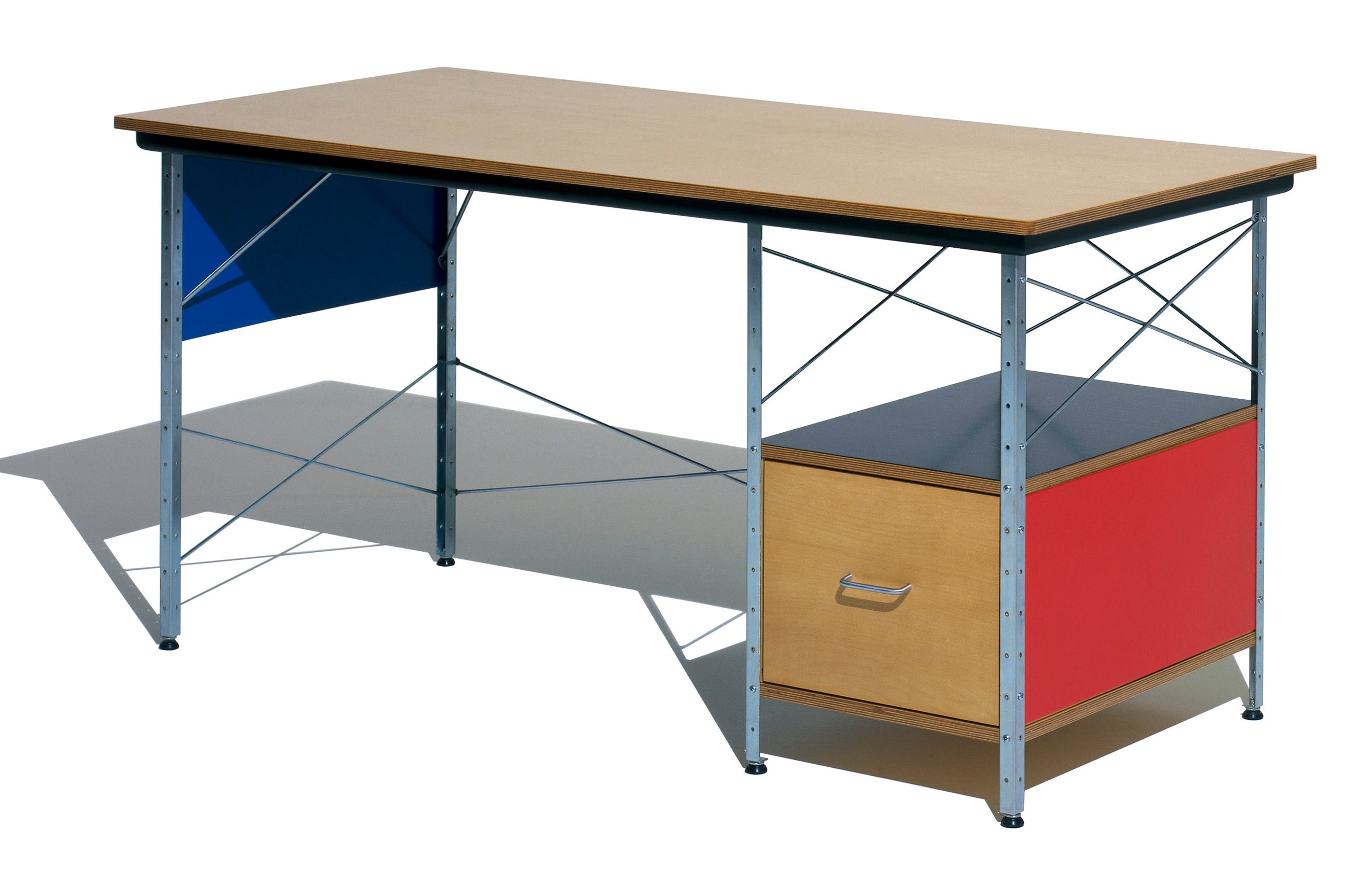 Called “working art” since it first exhibited at the Detroit Institute of Arts in 1949, this practical desk unit by Charles and Ray Eames features a spacious work surface and compact file drawer. In a neutral color scheme or a vibrant red, blue, black, or white combination, it makes a striking style statement in casual work spaces in both home and office environments.