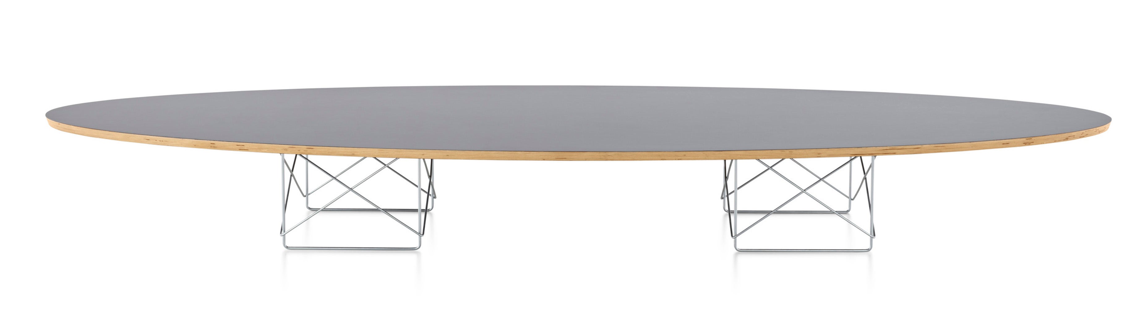 Often called “the surfboard table,” this large, low table, designed by Charles and Ray Eames, stretches out dramatically in front of a sofa or grouping of chairs. Its beveled edge brings out the grain of the laminate plywood top, synchronizing perfectly with its signature wire base to make a striking statement in both formal and casual environments.