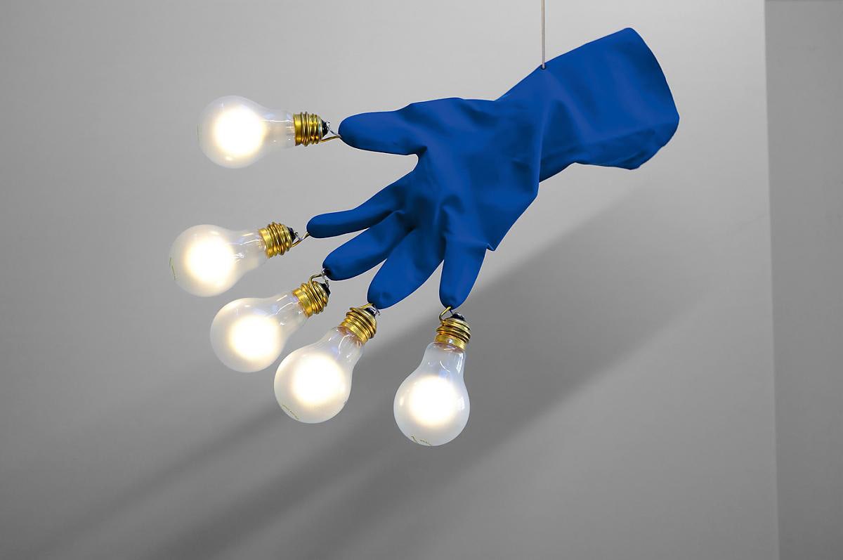 Luzy Take Five is one of the hanging lamps of the Luzy's family. It consists of a blue rubber glove with matt LED bulbs at the fingertips. The lamps from the Luzy's family are surprising and unusually free of design constraints and the boredom of always the same. Controversial and a clear statement. Each glove is hand painted with a special blue colour. Not suited for rooms with high humidity.