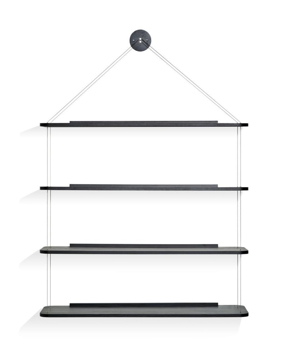 Originally designed in 1957, perfected over the years, and produced by Bernini in 1966. Seeking to pare down the structure of a bookcase to the absolute minimum, Castiglioni decided to hang the shelves on knots in two cords fixed to a single point on the wall.