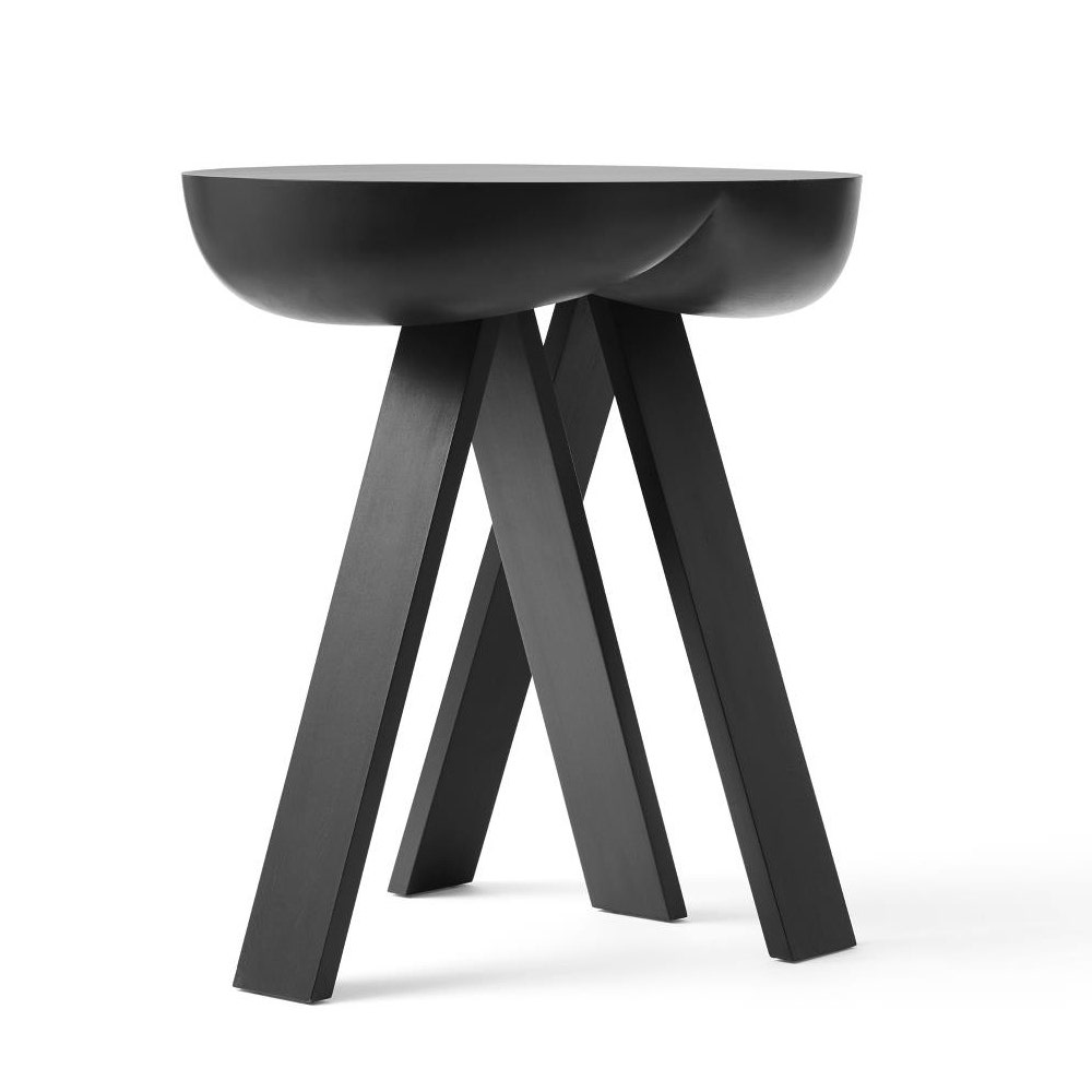 Striking. Wooden side table consisting of two stripped-down trestles and a table top. The seemingly heavy top contrasts the rigid trestles. The top gives in and provides space for the sharp ends of the trestles to lock the legs and the top together. Intriguing shapes, familiar yet not at all, balancing between art and design. Viewed from different angles the side table varies greatly. A design meant to puzzle our understanding of shape, form and function.
