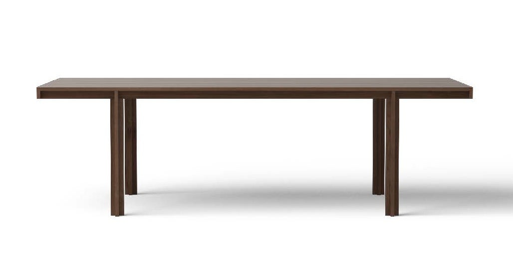 The solid wood dining table boasts a clarified form, repeating a simple angle throughout table legs and ends of the table top, while the dining chair with its circular seat and gently rounded backrest, beautifully upholstered, adds a softness to the clear, unfussed geometry, an invitation to linger.