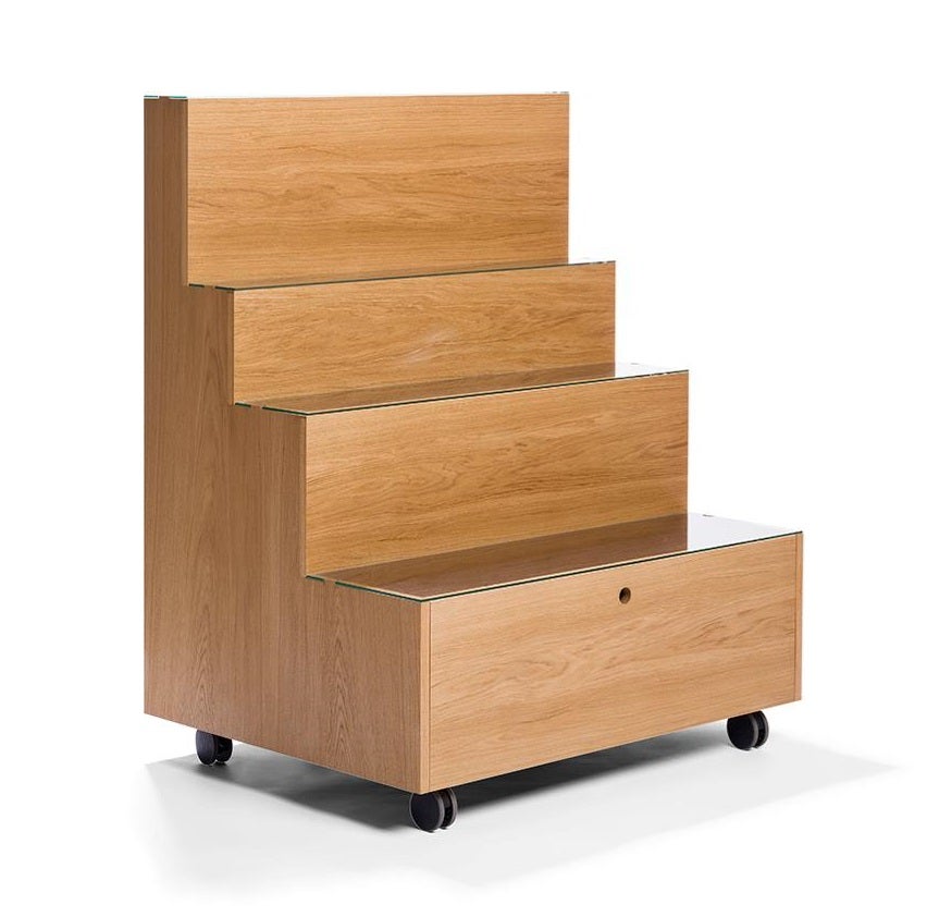 Rampa, a multifunctional station on wheels from 1965, was inspired by the traditional florist’s display stands found on Italian town squares. On one side, the steps serve as a bookshelf with the four steps being covered with tempered glass plates, and a compartment in the lower large step, which is closed with a flap door. At the opposite side of Rampa, there are two visible compartments for storage as well as a larger flap that, when opened, acts as a writing desk, and reveals two more compartments, and six drawers. Thanks to the four castors, two of which has brakes, the object can easily be moved around or fixed.
