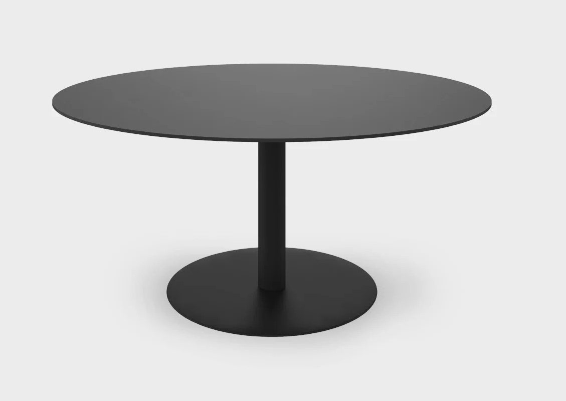 Round table in a variety finishes, with a single solid column supporting the table top. The minimalism and formal simplicity of the design are heightened by the strong materiality of the worktops.