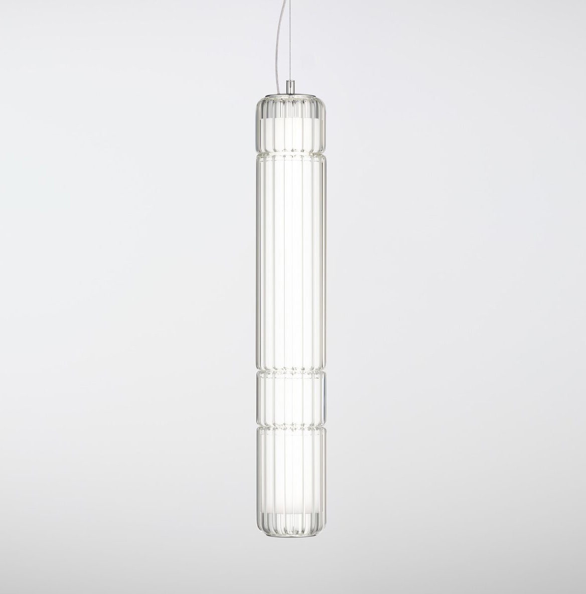Designed by Rockwell Group, the Stacking Collection merge cutting-edge technology and traditional glassmaking techniques. It includes three sets of floor lamps and a series of horizontal and vertical pendant lights. The floor version was conceived in 2007 and pays homage to the rich Venetian glassmaking tradition employing the “incamiciato” technique (Italian for “jacketed” or “layered”), which requires skilled glassblowers layer multiple glasses during the blowing process. This labor-intensive technique builds up different colors and opacities in each module. When these cylinder modules are combined and overlaps, a captivating mixture of colors cast a sophisticated ambient light. Sixteen years later, the suspended lamps are added to the collection. Stacking S is composed of a cylindrical diffuser powered by 5 high-quality LED strips. The decorative elements are made out of blown borosilicate glass. Machined aluminum end-caps keep everything together and act as suspension anchoring points. The "Naked" version without decorative glass is also available. With three different sizes for vertical versions and two for horizontal version, the suspended range can work in clusters and create beautiful and fascinating shapes of lights.