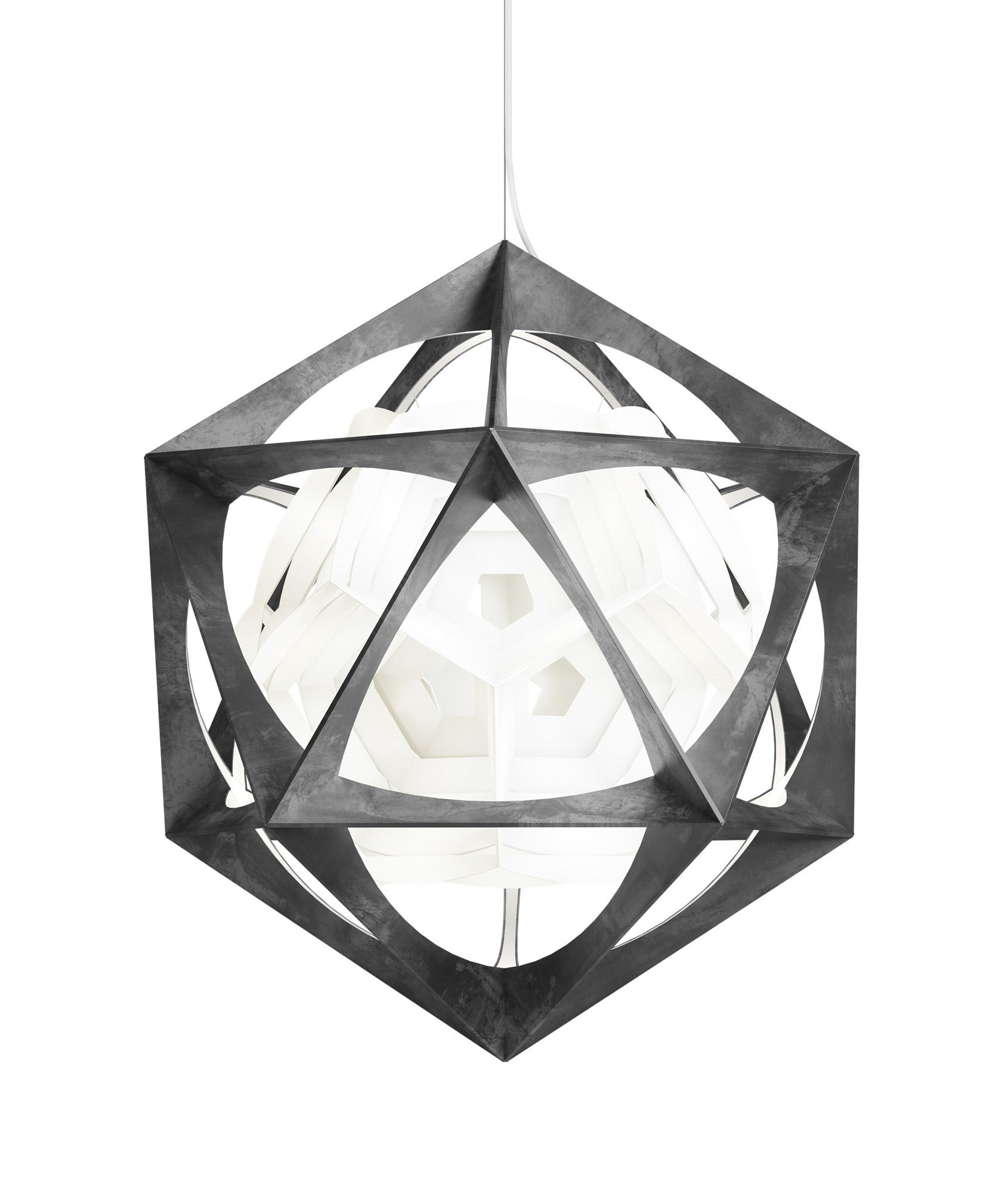 The pendant has 12 LEDs embedded in the inner vertices of the geometric frame that are connected to light guides along the inner edges, creating an even illumination towards the reflector in the centre of the lamp. This layered white reflector emits the light spherically back into the room, resulting in a glare-free uniform light.