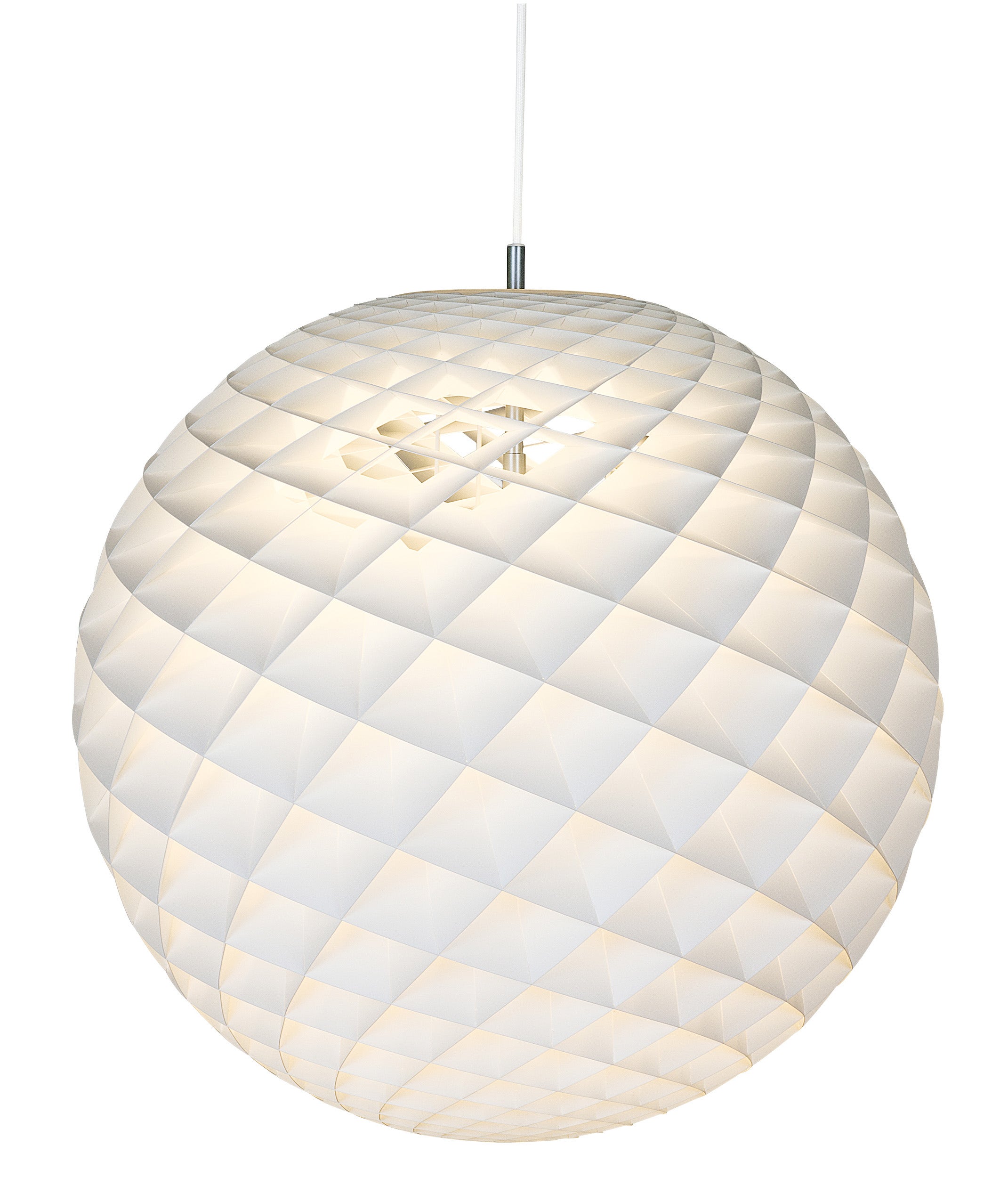 The pendant is a glowing sphere built up of small diamond-shaped cells. Each cell is carefully designed to capture light and to shield the light source from the viewing angles above 45 degrees. Each cell glows. Below 45 degrees, the fields are open to direct light downwards. A small amount of light is also sent upwards to illuminate the ceiling.