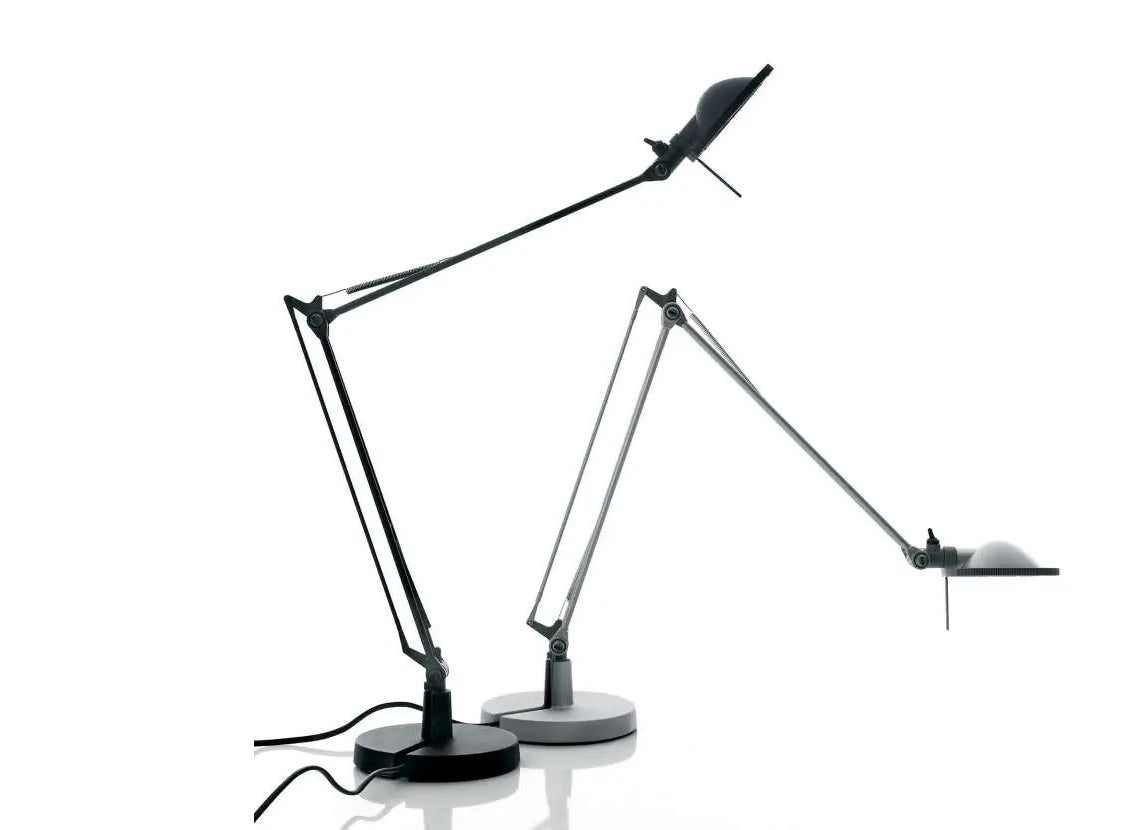 The Berenice table lamp is available with base (17.72 + 17.72 inch or 11.81 + 11.81 inch arms). It is the inimitable founding product in a new type range of reasonably small sprung-jointed lamps. The fluid articulation of its movements and its perfect stability make Berenice the light that can be moved around without occupying precious space and with the least trouble. Berenice operates with a transformer that allows low tension current to reach the bulb through its rods without electric wiring. Its figure thus remains slim and elegant. With a special distancer housed in the lower part of the head, the light can be brought very close to whatever needs to be illuminated, while maintaining the right and safe distance from objects. By simply touching the head ring, which is well insulated and independent from the bulb housing, the light can also be moved in any direction.