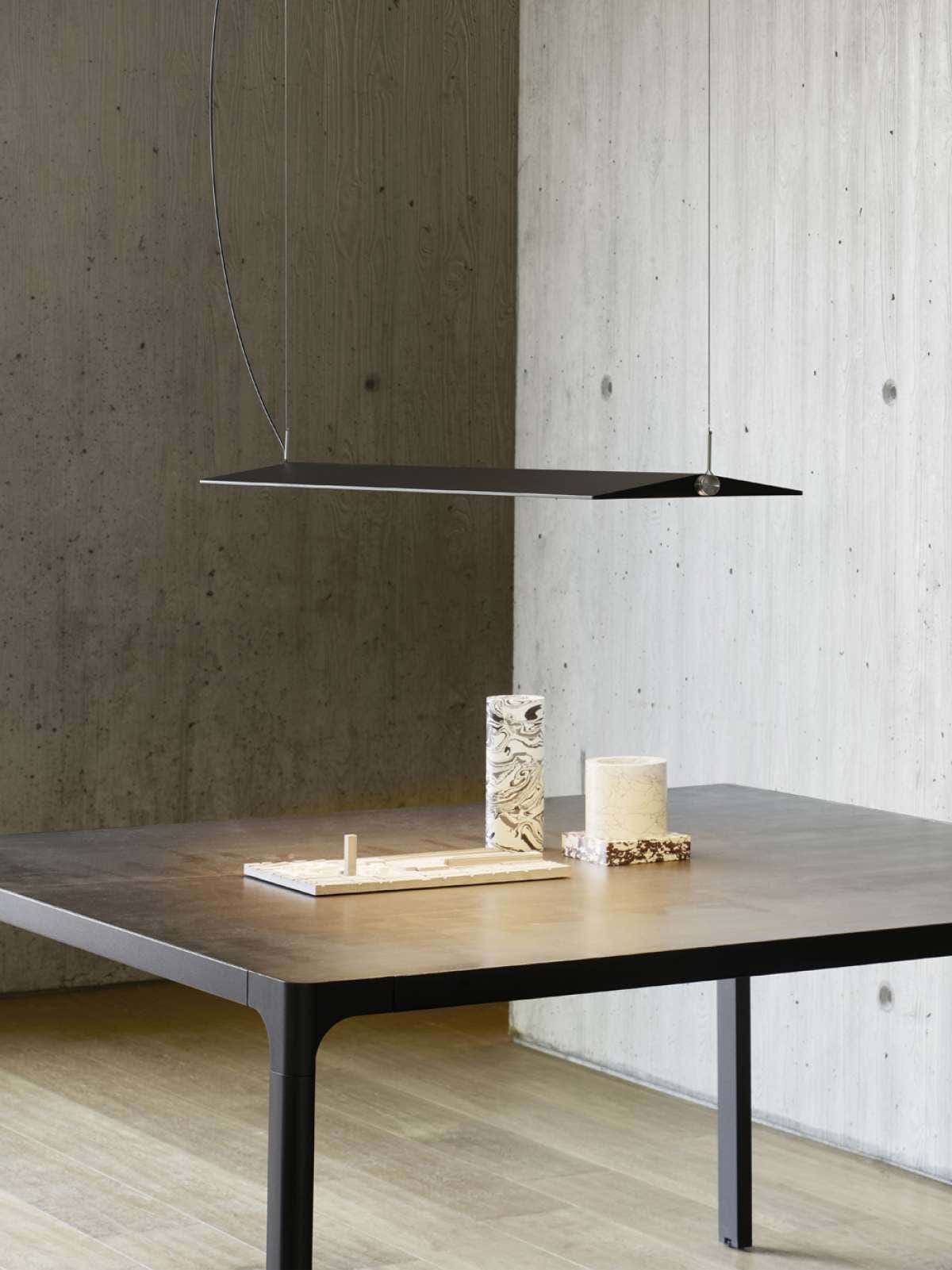 The suspension version of Fienile is made in a single size for the roof, whose lower portion contains a homogeneous light source for high performance without glare. The lamp provides light directed upward and downward, thanks to great freedom of movement, permitting rotation of 360 degrees. It is possible to connect up to four suspension lamps (for Europe version) or two suspension lamp (for Americas version) with a single power cord, conserving the rotation of each unit.