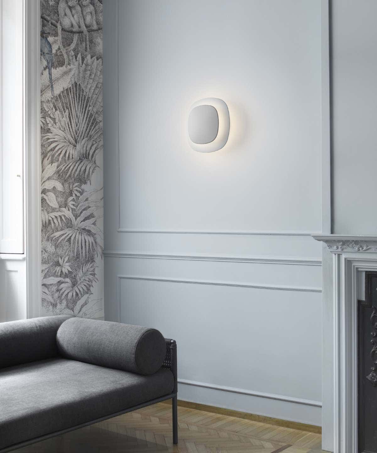 A wall lamp with extraordinary decorative character and immediate impact. The structure is the result of the staggered overlaying of two concentric surfaces in technopolymer. The lamp emits indirect light thanks to the interaction of the planes that produce a reflection of the beams, in a cloud of light with a gentle spirit. A compact but very functional lamp of sophisticated beauty that is never excessive, Luthien combines aesthetic and emotional value in a precious object with the classic practicality of a wall lamp.