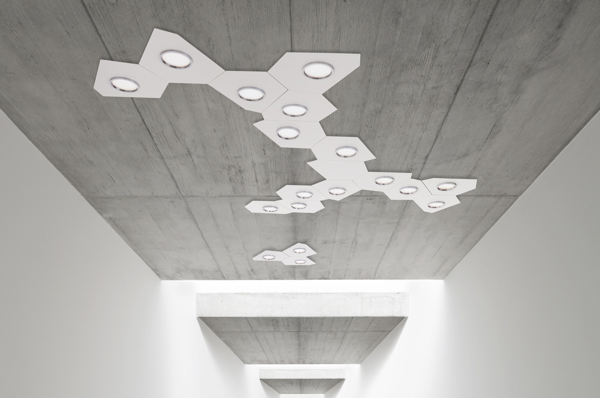 An irregular hexagon and a light circle in its inside. This is the origin of possible endless combinations. DOMINO is a new concept of ceiling lamp. A system that invites to combine different tiles of an always new light mosaic. As in the Chinese game of tangram or in a nature fractal, the logic of the compositions is open and creative.