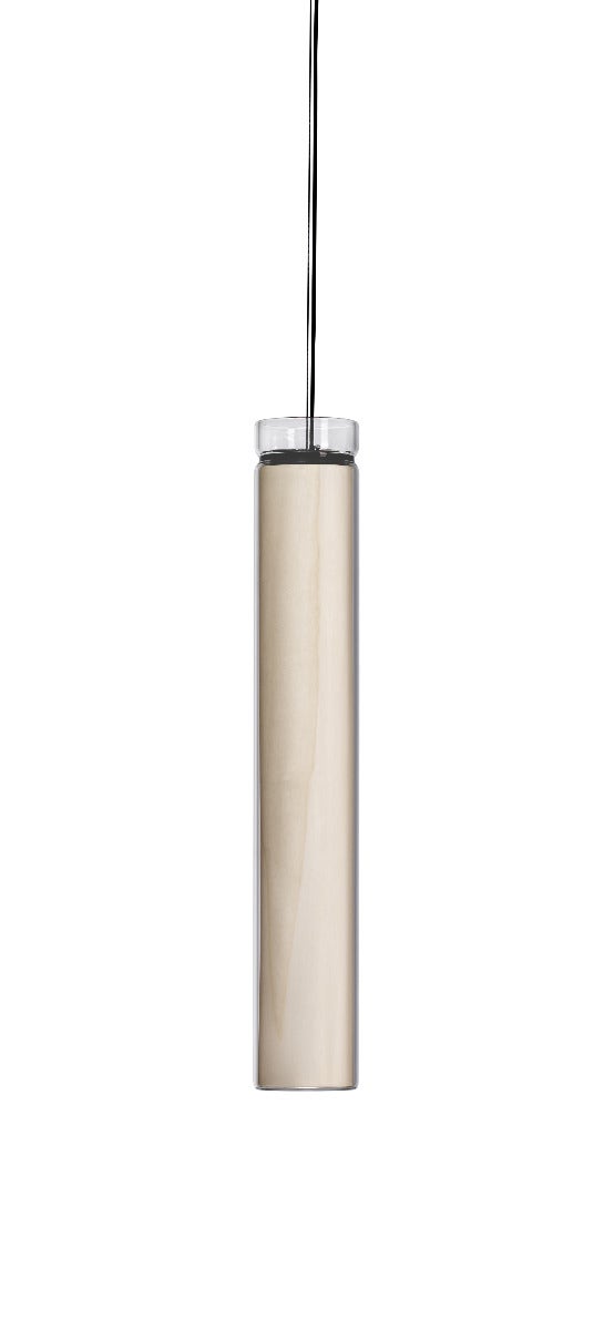 Designed by Mayice, Estela is now available in a vertical formation with three sizes: 100 cm, 60 cm, and 40 cm. A single piece of borosilicate glass is hand-blown by master artisan Eduard Garuti, and contains a cylindrical wood veneer diffuser. Estela’s new vertical alignment is truly radiant and showcases the lamp’s artistic merit. Up close, the natural imperfections in the hand-blown glass simply augment the lamp’s warmth, charm, and elegance.