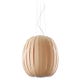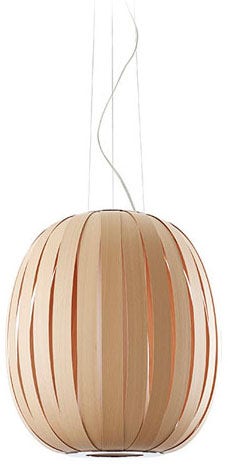 Kin to the Poppy pendant, Pod is a vertically elongated and ellipse-like orbit of light whose body is made up of a repeated series of wood veneer strips. Different from the Poppy, a small gap between each strip on the Pod allows just a peek at the light within. Designed by Burkhard Dämmer, Pod is available in medium size.