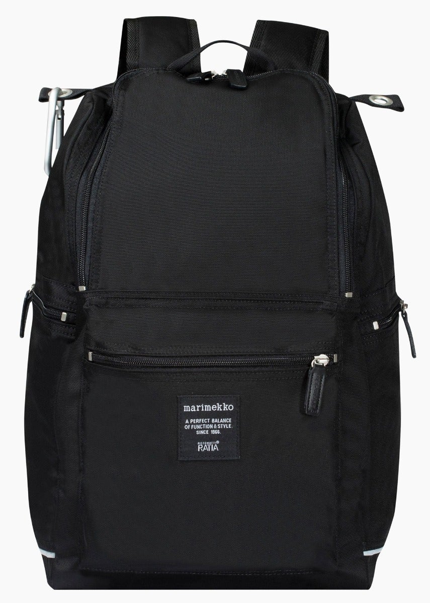 A polyamide backpack with adjustable padded shoulder straps and three exterior zip pockets. The interior features a padded back and a netted zip pocket.