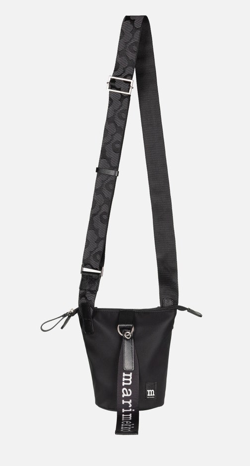The Essential Bucket shoulder bag is made of recycled nylon. The small bag has a zipper closure and an adjustable shoulder strap with the jacquard knit Unikko pattern. The front features the Marimekko keychain and there is a slip-in pocket in the back. The bag has leather details.