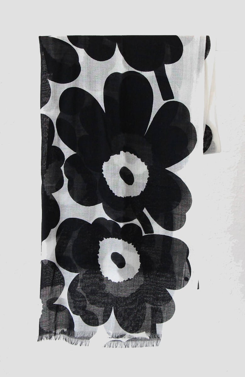 The Fiore scarf is made of sheer wool and it features the Unikko pattern. The scarf has unfinished edges at the ends.